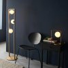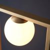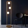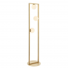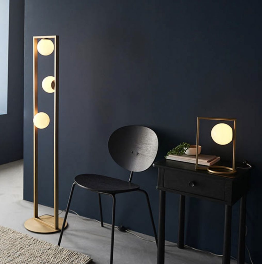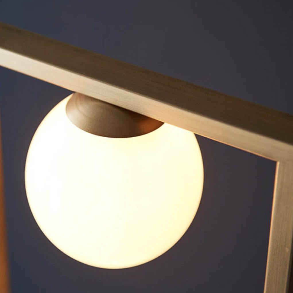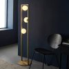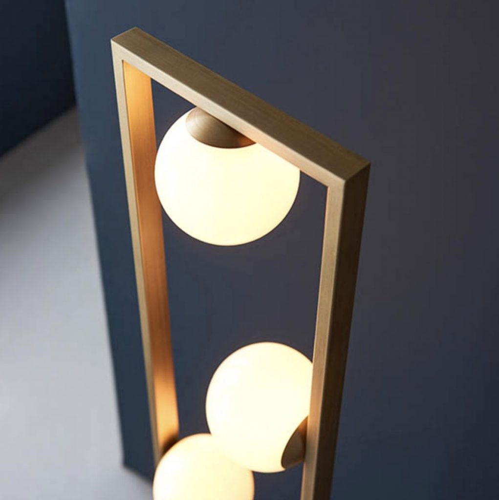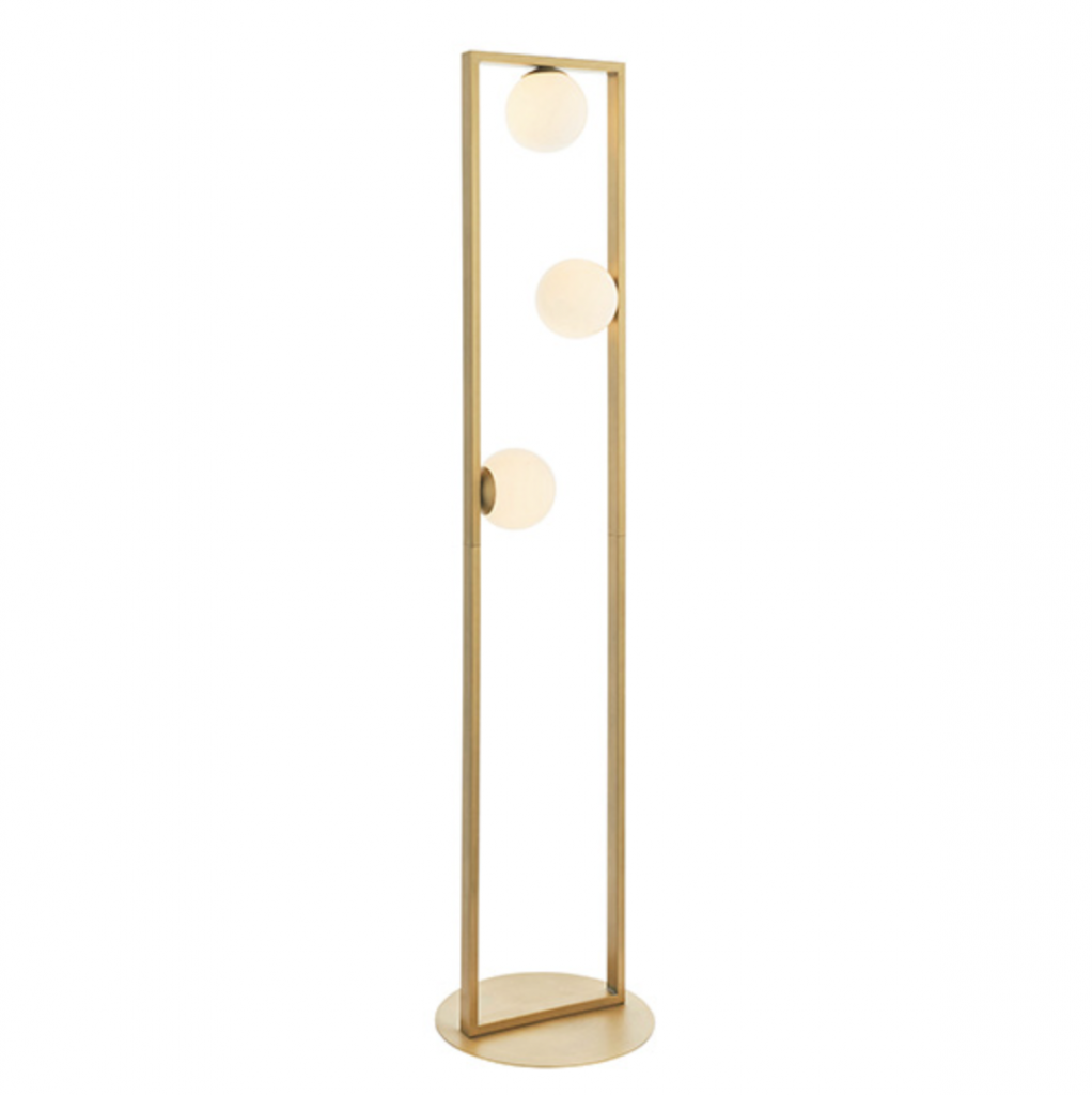 Brushed gold finish metalwork floor lamp with gloss opal spherical glass shades. Inline on/off foot switch with 2 metre light grey fabric cable.