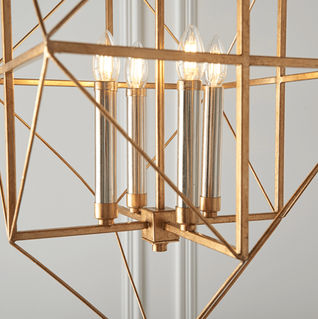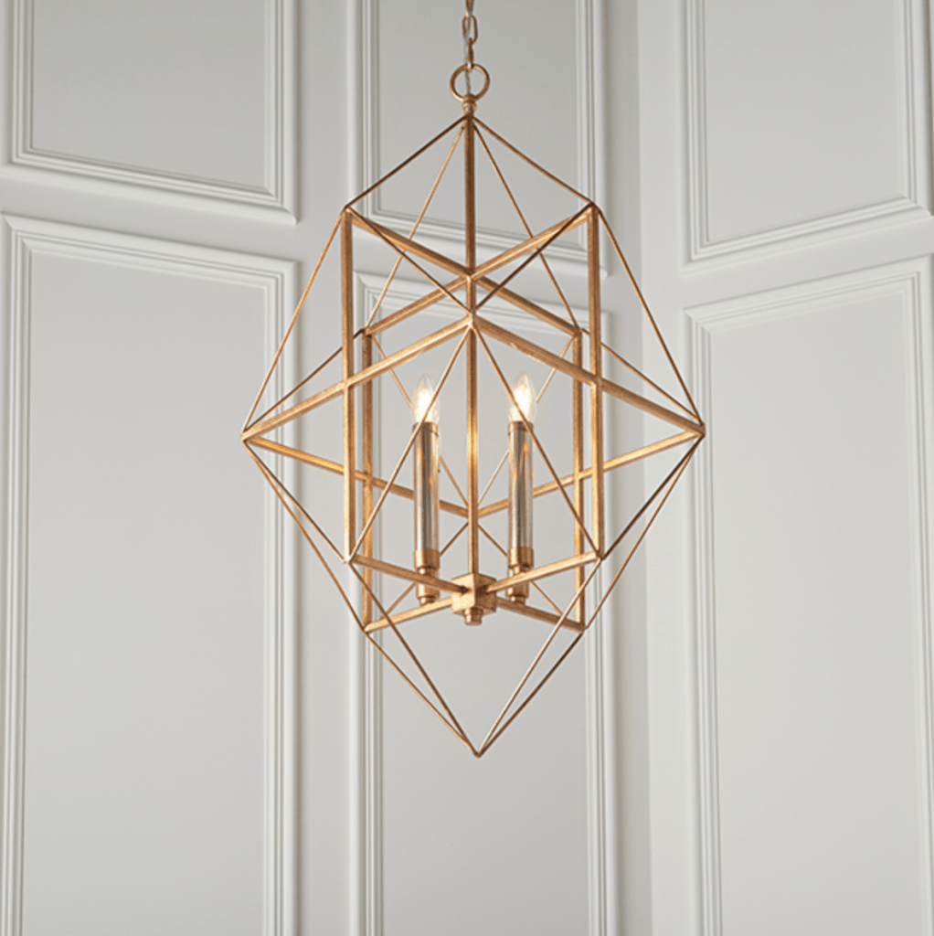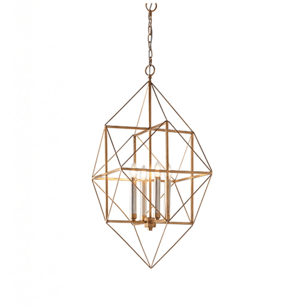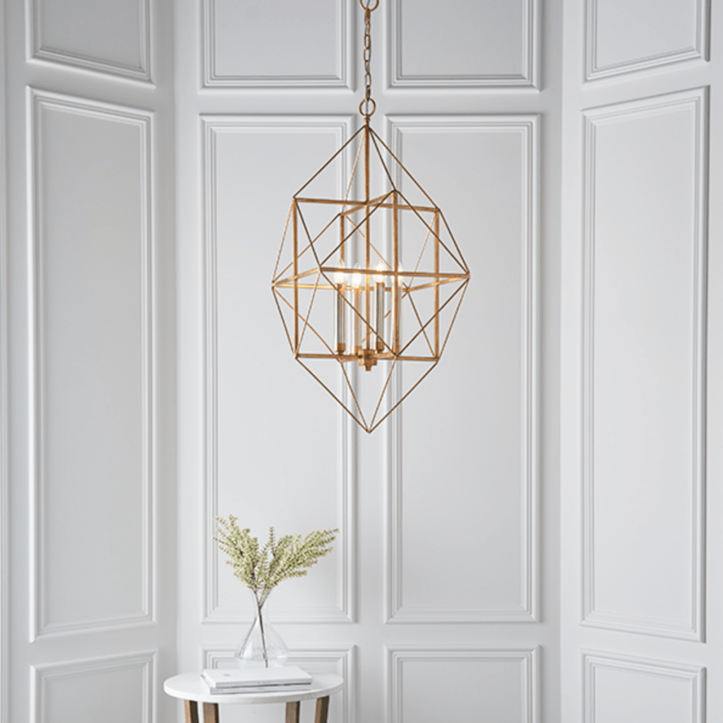 Large gold leaf angular framed multi pendant. Height adjustable 1.7 metre chain with clear cable.