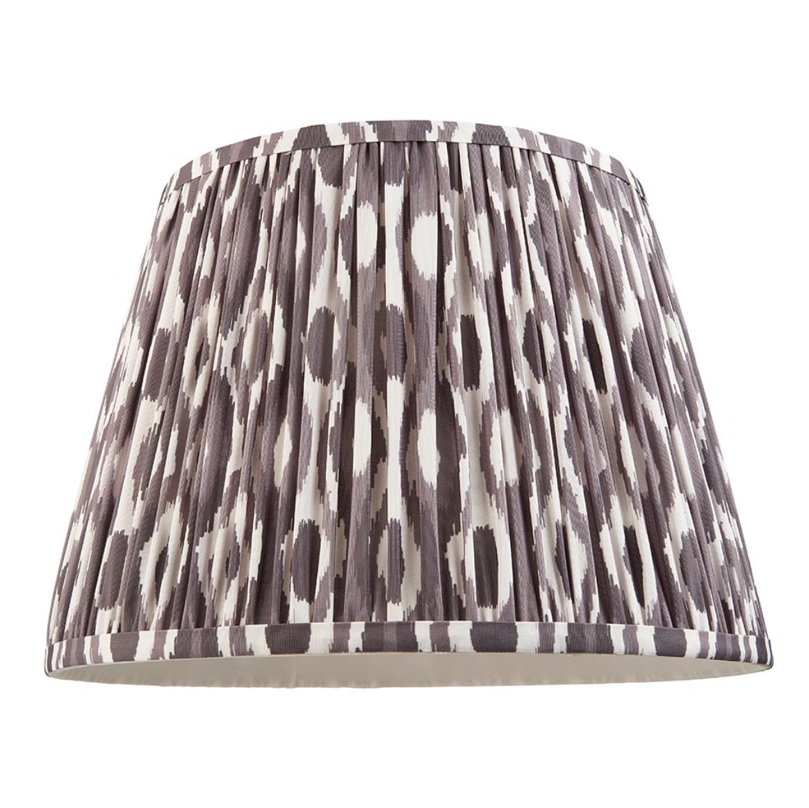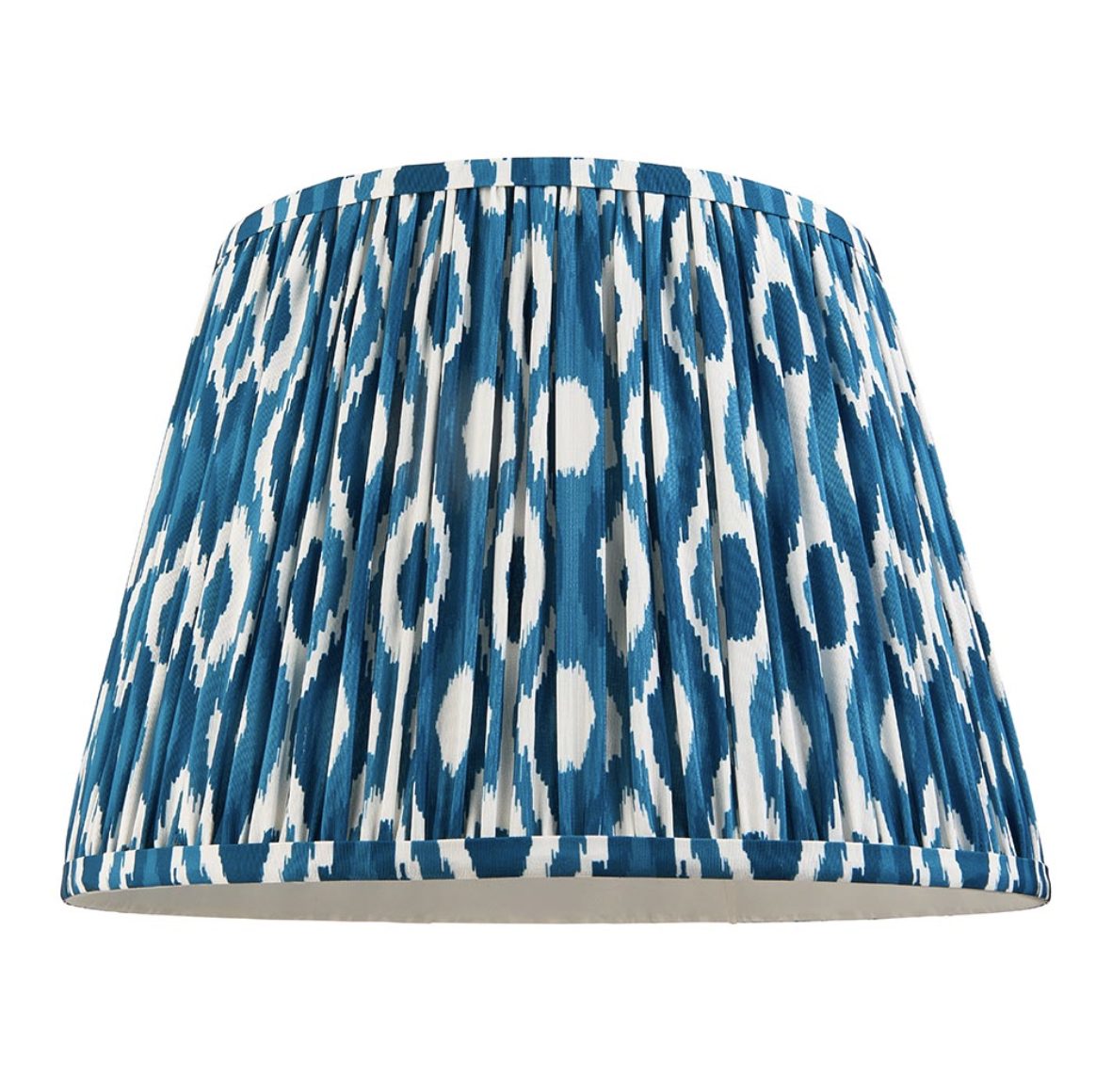 35cm tapered shade with reversible white gimbal. Unique Ikat pattern design with taped edge detailing and plain inner lining.