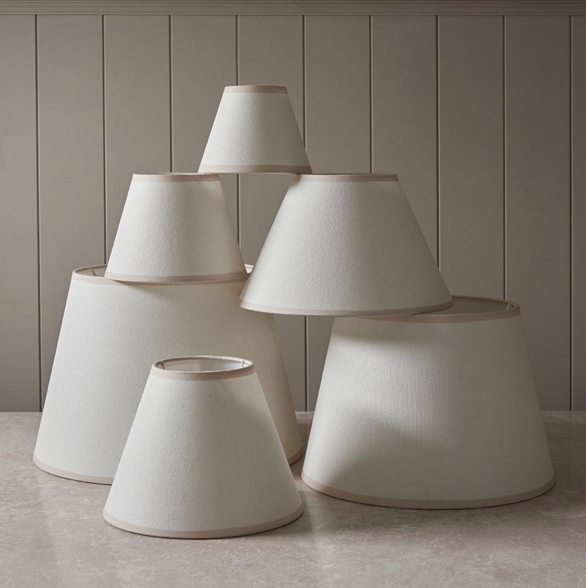 Tapered shade with clip gimbal to fit golf or candle bulbs. Easy to place in all interiors due to the classic neutral colour tone, with complementary colour taped edge detail.