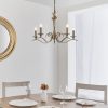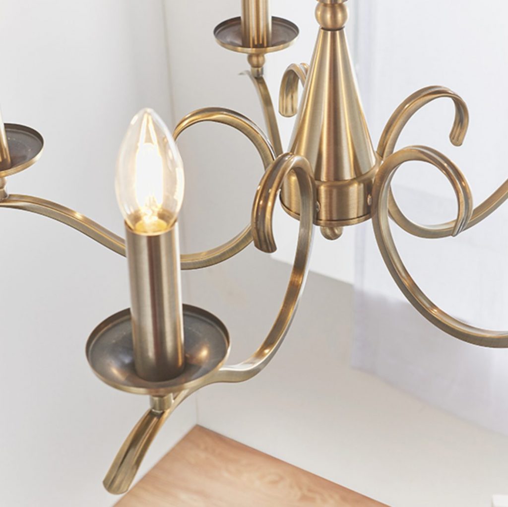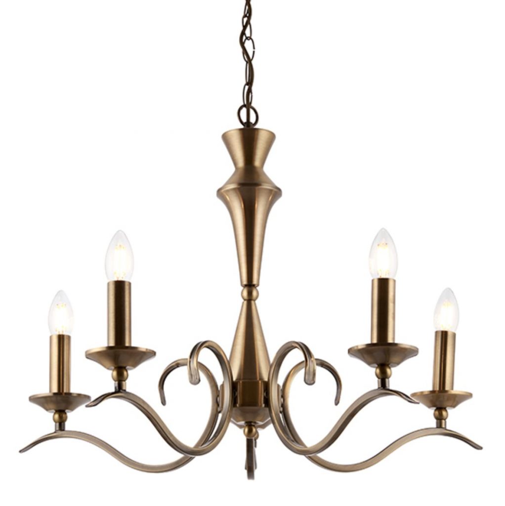 The Kora 5 light chandelier is finished in antique brass effect, this fitting has an adjustable drop and can also convert to a flush fitting, is suitable for use with LED lamps and is dimmable.