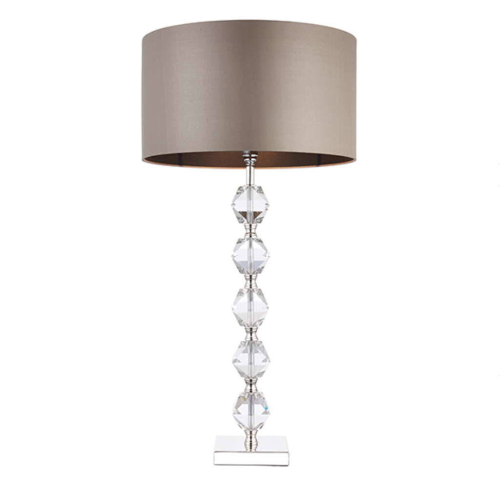 The Verdone table lamp combines crystal detailing with a silver plate finish on the base and stem. Supplied with a mink coloured faux silk shade which has a black inner, this fitting is also suitable for use with LED lamps.