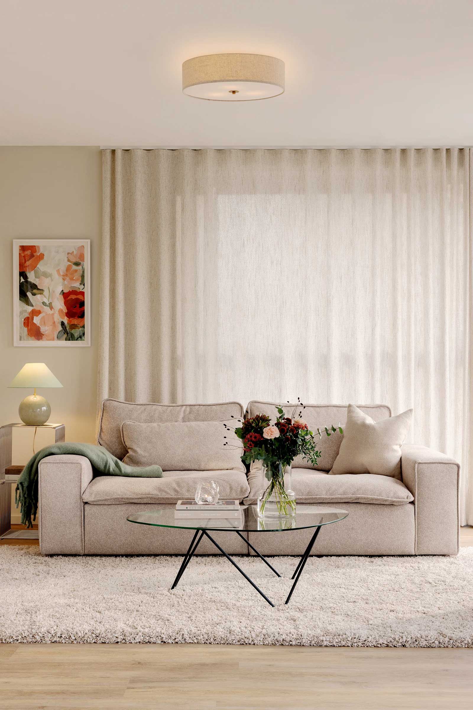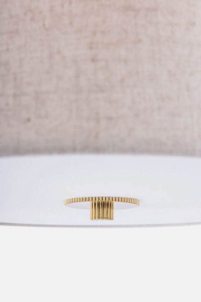 Noah is handmade from dyed linen fabric and becomes a sober and decorative ceiling lamp. The lamp is combined with a detail in real brass, the fabric has a vibrant pattern and a white glare shield in the same linen fabric at the bottom to spread a pleasant light.