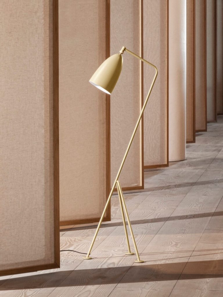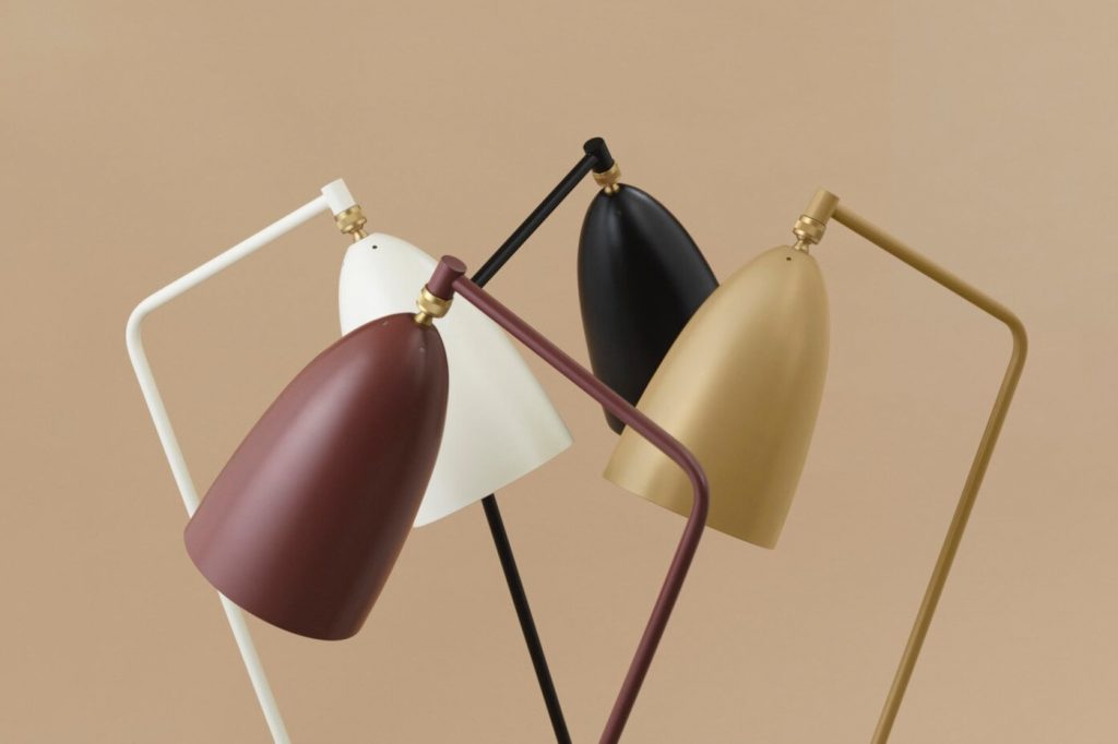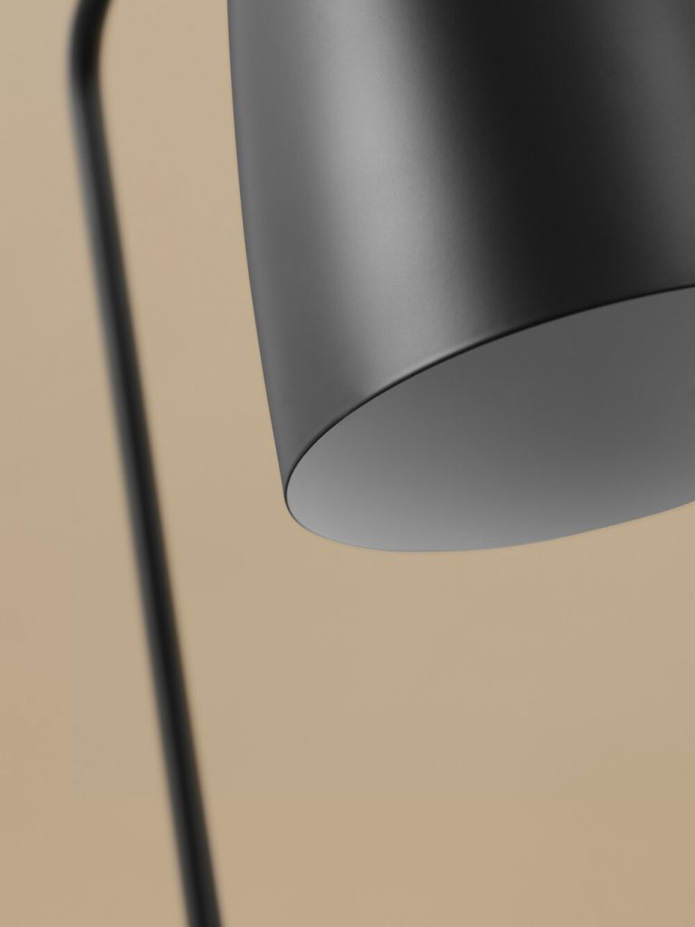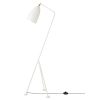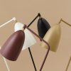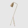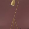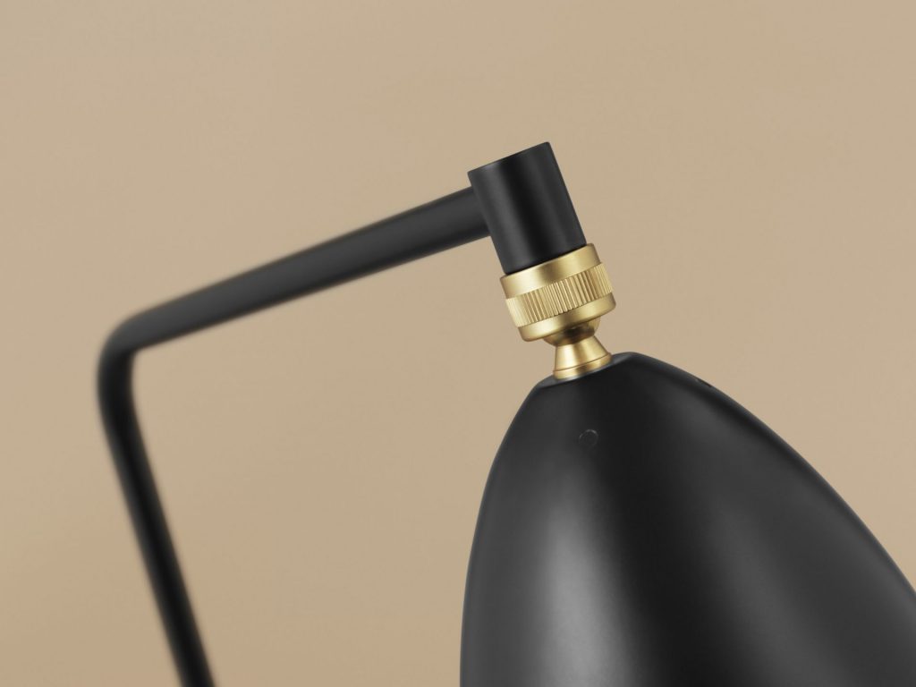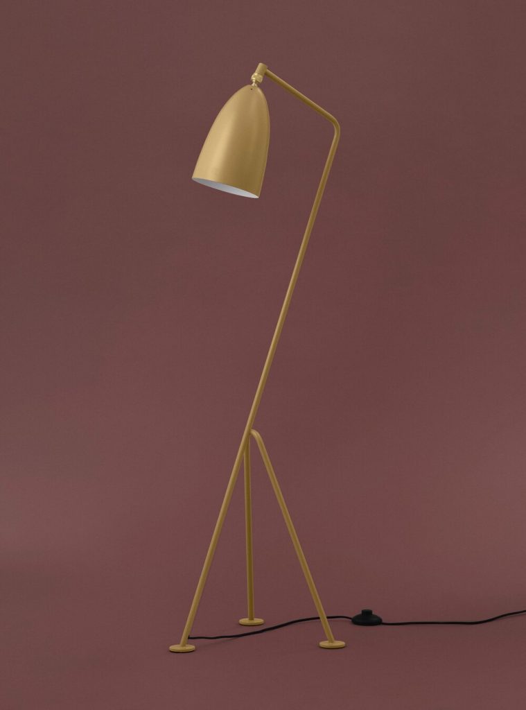 Gräshoppa floor lamp – the tubular steel tripod stand is tilted backward and the elongated aluminium conical shade is ball-jointed onto the arm. Both stand and shade are powder-coated and available in a variety of finishes.