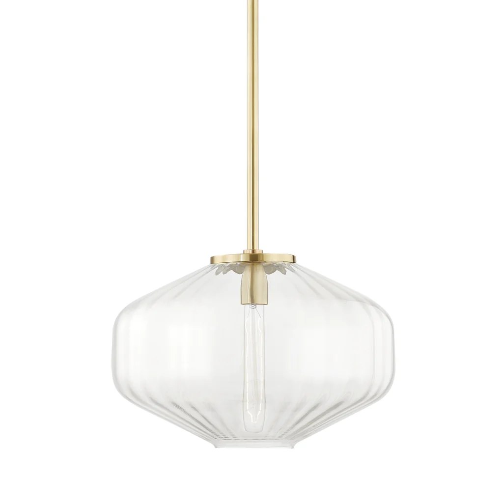 Defined by an octagonal-shaped, ribbed shade, Bennett is glass blowing at its finest. A single carbon filament bulb suspends from a metal bulb base and casts a clear, beautiful glow.
