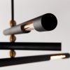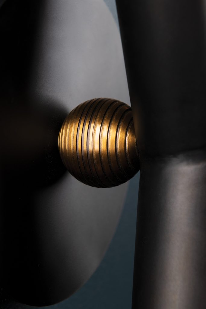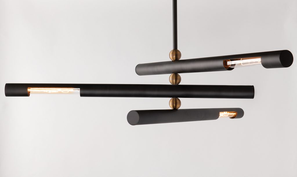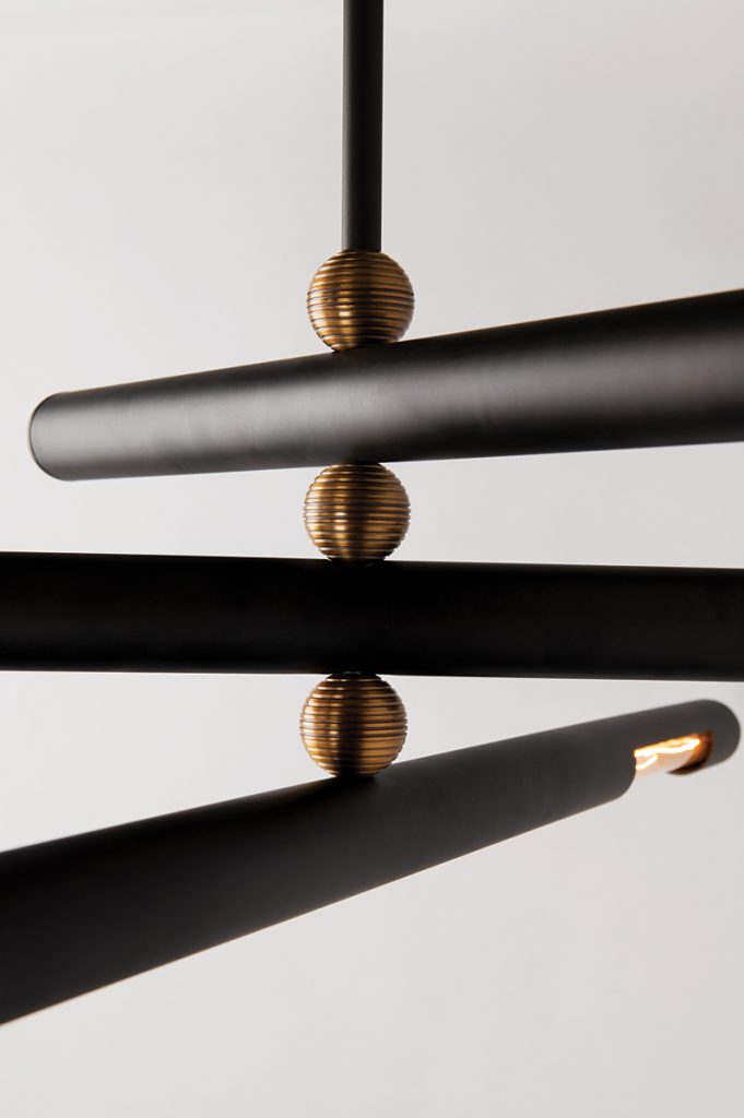 Minimalist, elegant, and novel, Hendrix layers dark tubes and ridged brassy spheres against each other in an imaginative light fixture. With a feeling almost magnetic, the sconce has a futuristic noir feel while the suspended versions evoke a mobile art installation. Its large scale helps it make an impact on the space it illuminates. Hendrix’s light source peeks out through well-placed apertures, scintillating glimpses of crackling energy.