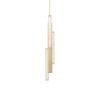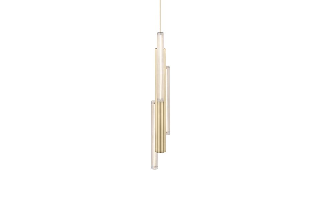Hail is inspired by the shards of light and shadow often experienced from lancet windows in vast church arches. Hail has an elongated fluted form fabricated in aluminium with asymmetrically positioned reeded glass lightbulbs placed along its structure.