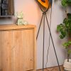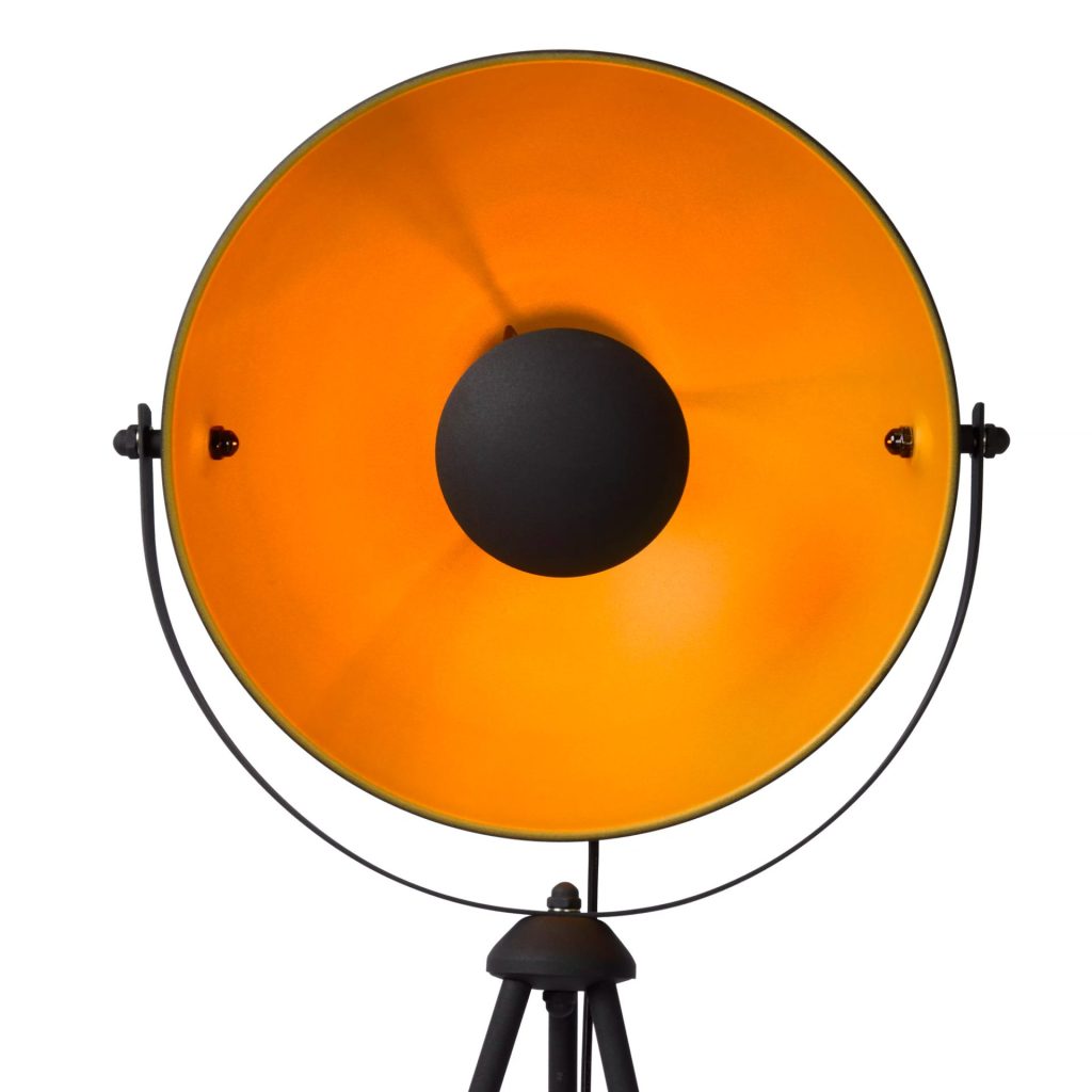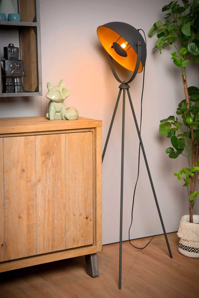 A steel stand with three legs that supports the semi-circular lampshade with a golden interior.