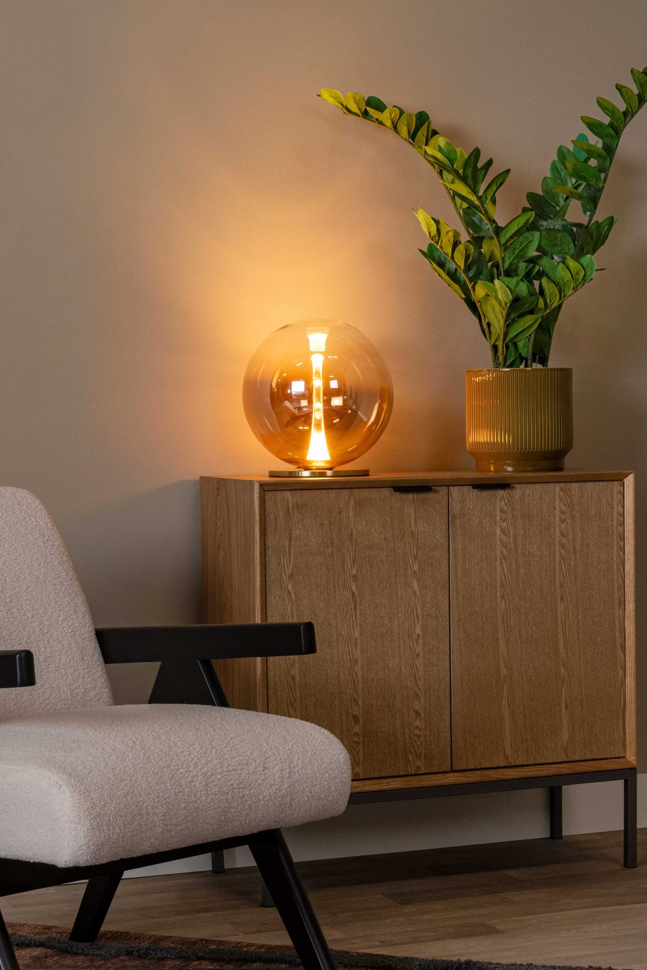 The clear glass sphere with integrated LED bulb rests on an elegant, slim base. Simply switch the table lamp on or off via the switch on the cord and immediately enjoy the warm, white light that Gisela sends out.