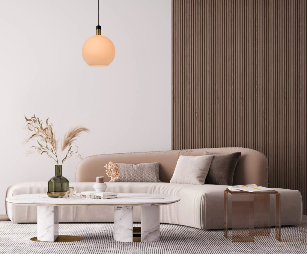 The opal glass surrounds your vintage pendant light in mystery. The light bulb is only partially visible through the glass lampshade and spread the light down from the centre.