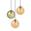 The 3 light sources are suspended at varying heights, surrounded by different coloured glass spheres. The ribbed surface of the glass creates a dynamic play of light.
