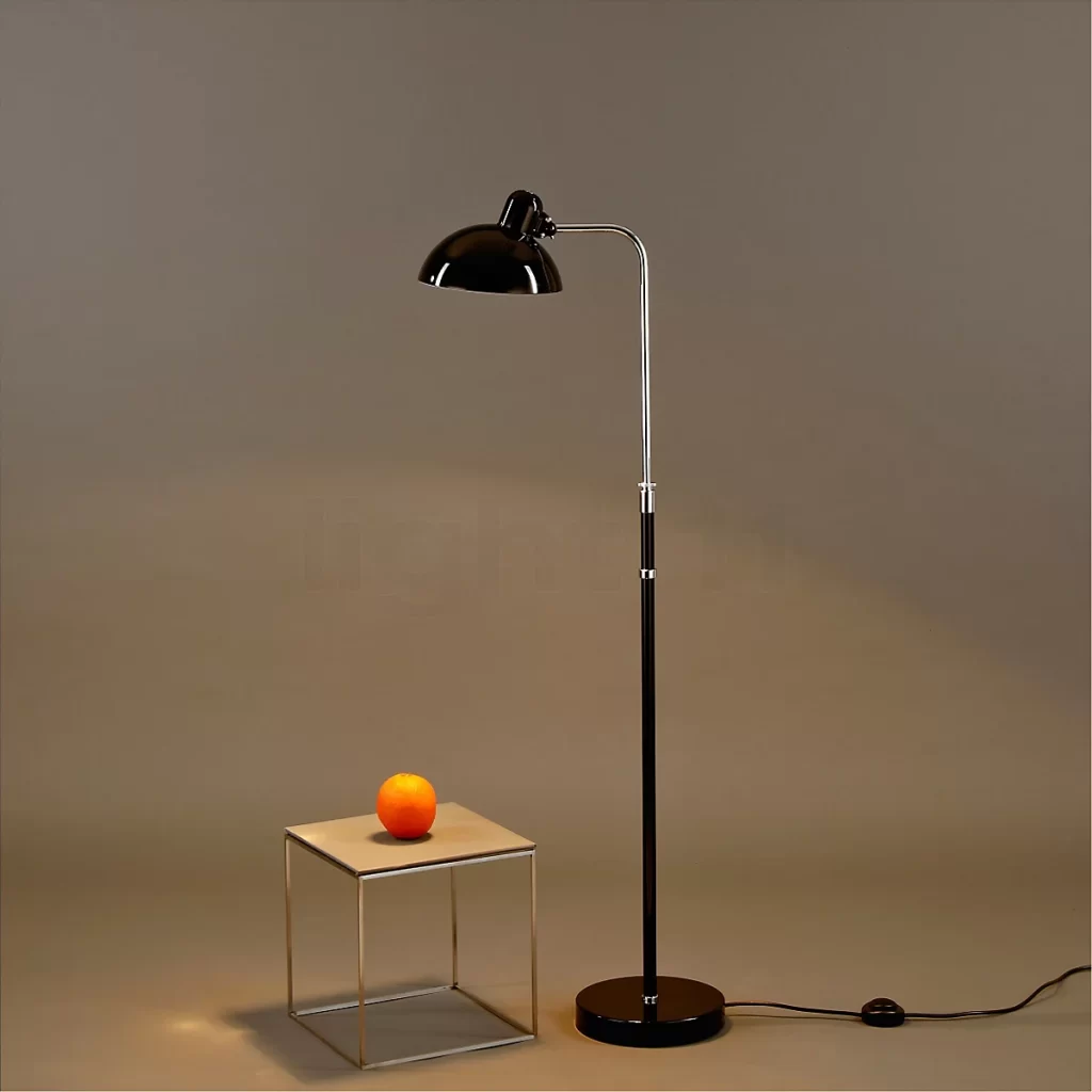 The 6580-F Luxus floor lamp, designed by Dell in 1936, is adjustable in height. The ball-jointed lampshade has an adjustable tilt head for directional lighting.