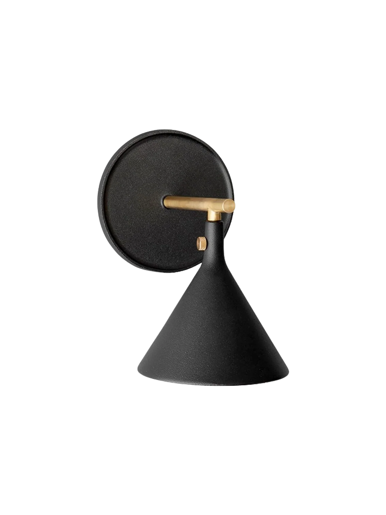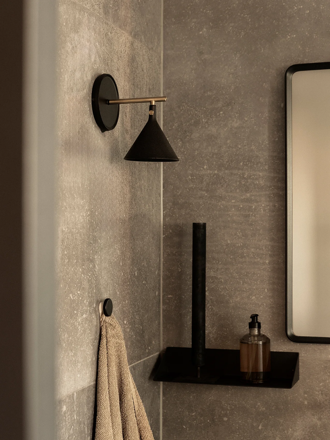 The Cast Sconce Wall Lamp merges triangular, linear and round elements into a sophisticated silhouette. Purposeful and with presence, its geometric form is shaped from black metal detailed with brass. Adding to the ambience of a room both when switched on and off, the lamp is fitted with a replaceable LED light bringing soft, glare-free light to a wide range of spaces, including bath and shower rooms and outdoors, thanks to its IP44 rating.