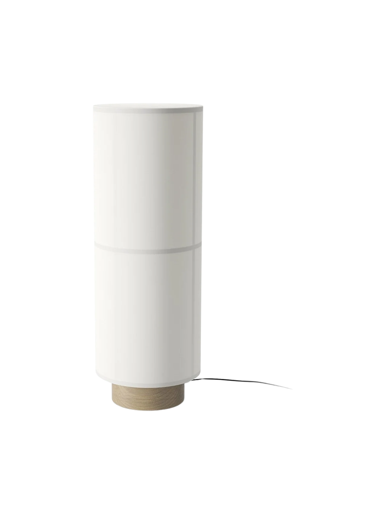 The Hashira Floor Lamp stands tall with its cylindrical silhouette, merging the essence of western textile lamp shades to evoke a sense of familiarity. Its translucent fabric shade serves multiple purposes: diffusing the light in various directions, creating a warm and comfortable ambiance, and enhancing the interior’s softness both visually and physically. This unique combination not only adds a touch of charm but also contributes to the acoustics and tactile experience of the space.