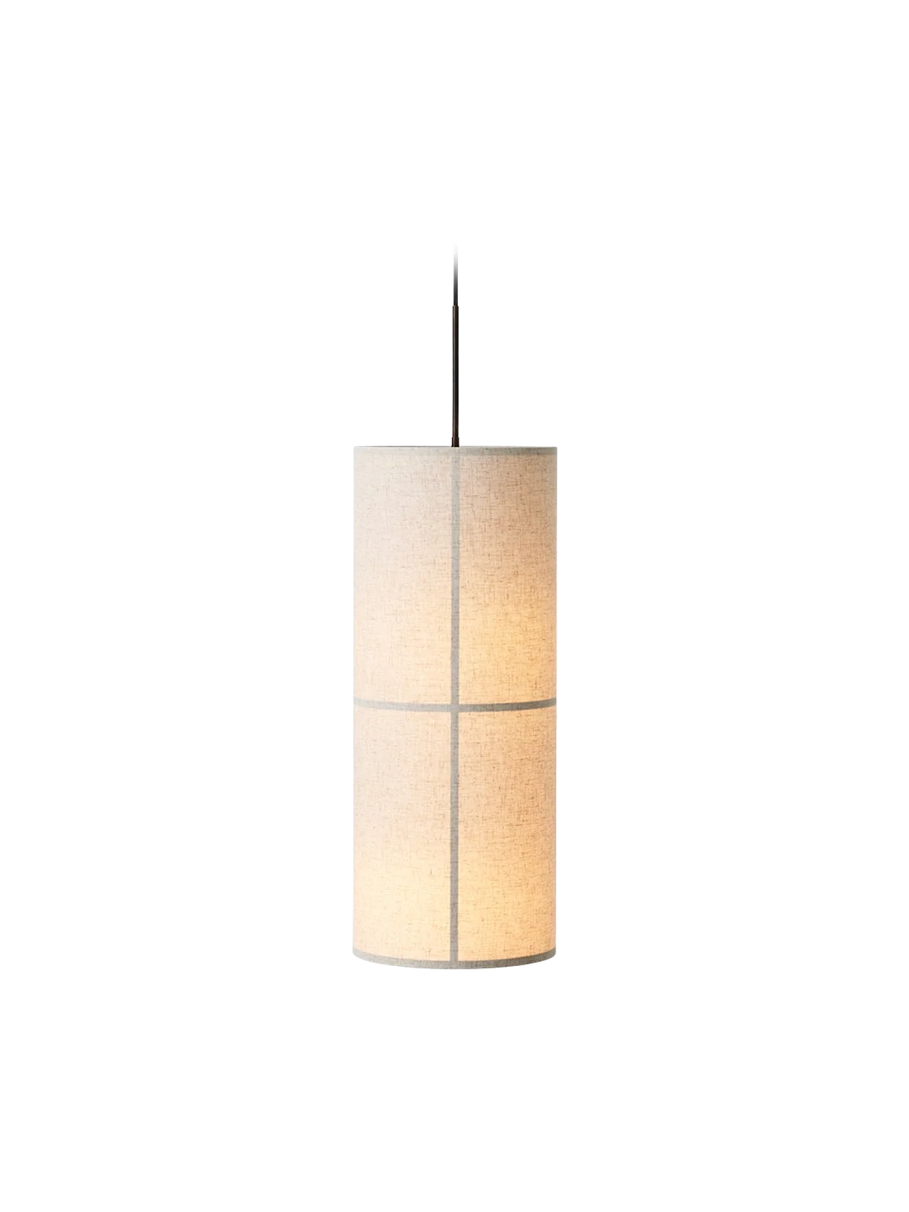 The collection’s pendant light is created with the same column-like shape as the floor and table lamp, carefully covered with translucent fabric that reveals the graphic structure within and suspended from the ceiling by a textile cord.