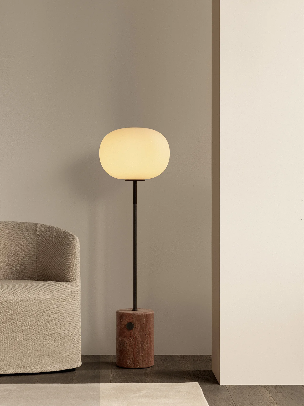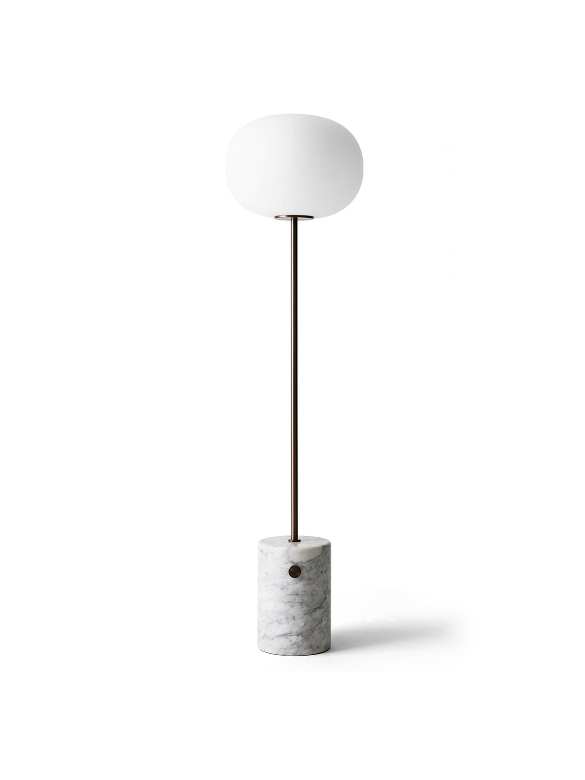 The JWDA Floor Lamp is part of a collection of lighting inspired by traditional oil lamps. Crafted from contrasting materials, the elegant yet bold design is a lesson in refinement and a study in geometry. An elliptical opal glass shade, a slender metal stem, and a rectangular marble base fitted with a dimmer switch come together to create this timeless addition to modern spaces.