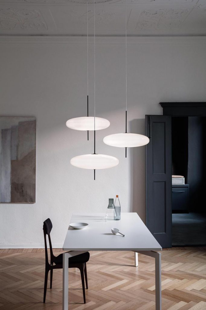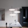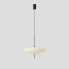 The Model 2065 consists of a diffuser made of two joined opalescent saucers, suspended from the ceiling with a black-painted aluminium canopy. The simplicity of Gino Sarfatti’s elliptical design and the lightness of the materials make for a seemingly weightless luminaire. Opaline Methacrylate Diffusers, Aluminium Structure.