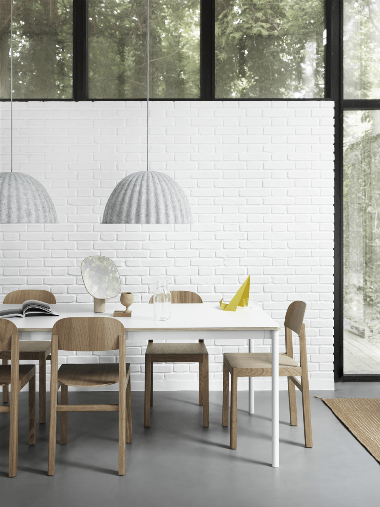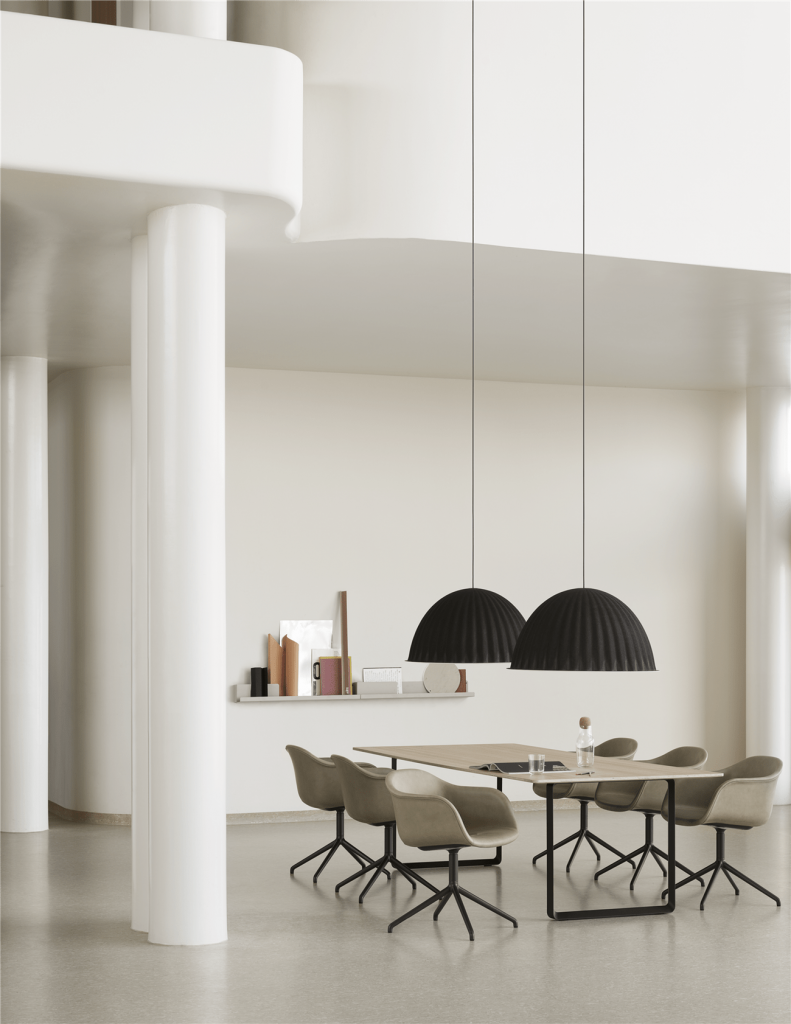 Designed in a material that uses up to 80% recycled PET fibres, the Under The Bell Pendant Lamp not only brings a tactile and modern expression to any space but also enhances the acoustics of a room through its soft shade, paired with its graphic lines and subtle colour palette.