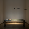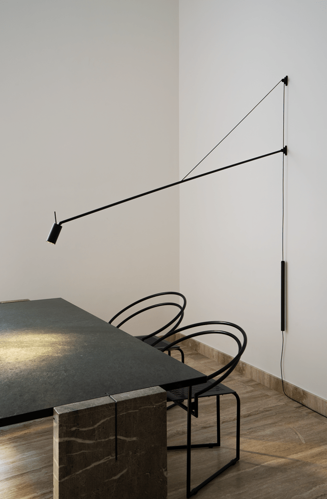 SWAN is a dimmable LED wall lamp for direct lighting. Aluminium matte black painted structure. Arm rotation of 40° vertically, contained by a leathered counterbalance, and 180° horizontally. Its directable cylindric head allows to flexibly orientate the light beam, with optional honeycomb filter for antiglare. Dimmer on cable.