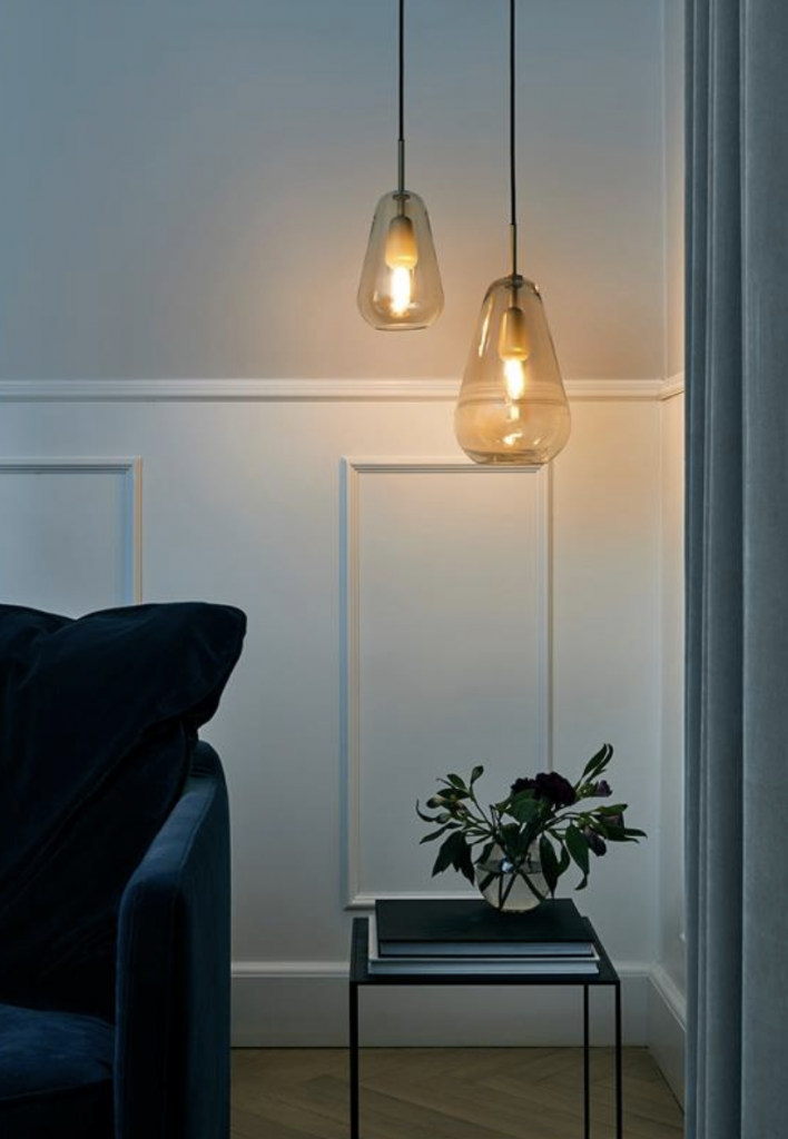 The Anoli collection is made of materials of the highest quality and crafted by skilled artisans. Its expression is simple and consists of mouth-blown drop shaped glass pendants.