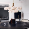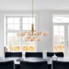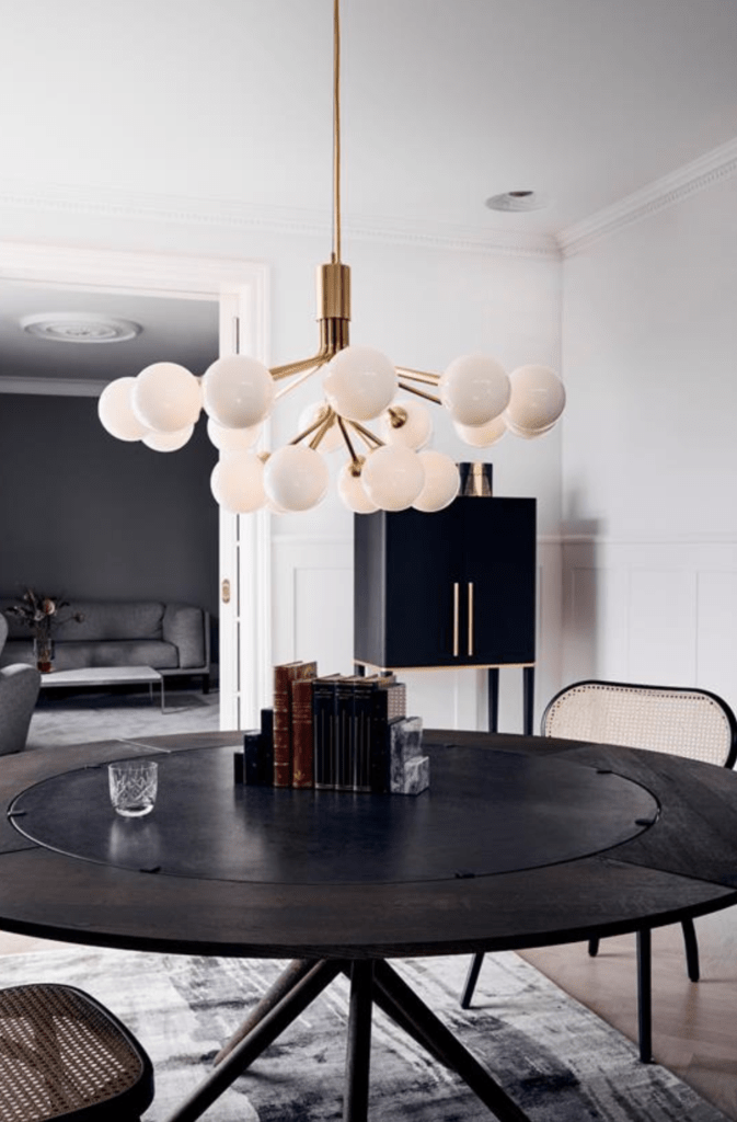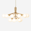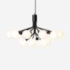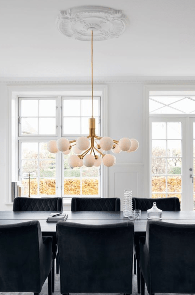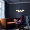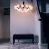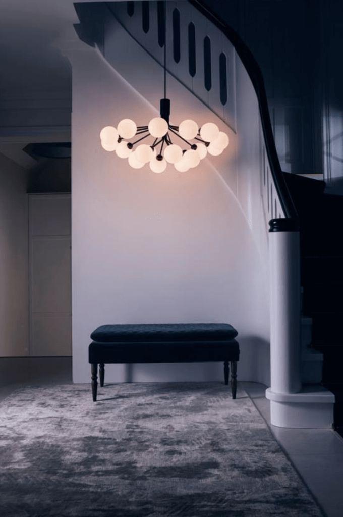 The Apiales consists of 18 mouth-blown glass globes and are available in golden Brush Brass finish or the smooth Satin Black. From a specially-produced canopy, the arms unfold like flower stalks from which light is spread with grace. Apiales 18, with its 90cm in diameter, fits as the centrepiece in the foyer, a large living room or over a large dining table.