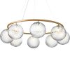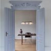 Miira 8 Circular has a classic appearance and is designed to hang high or low from the ceiling. A special wire system is used to adjust the height with ease from 20 to 250 cm. The Miira chandelier comprises a powder-coated metal ring in a brass colour and, from this, mouth-blown glass domes in optic clear glass spread a sensuous light. The simple, classic design makes this chandelier a useful element in many interior designs.