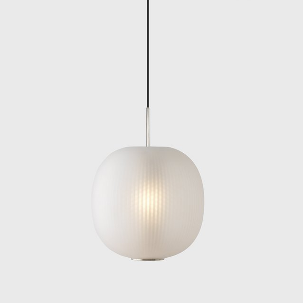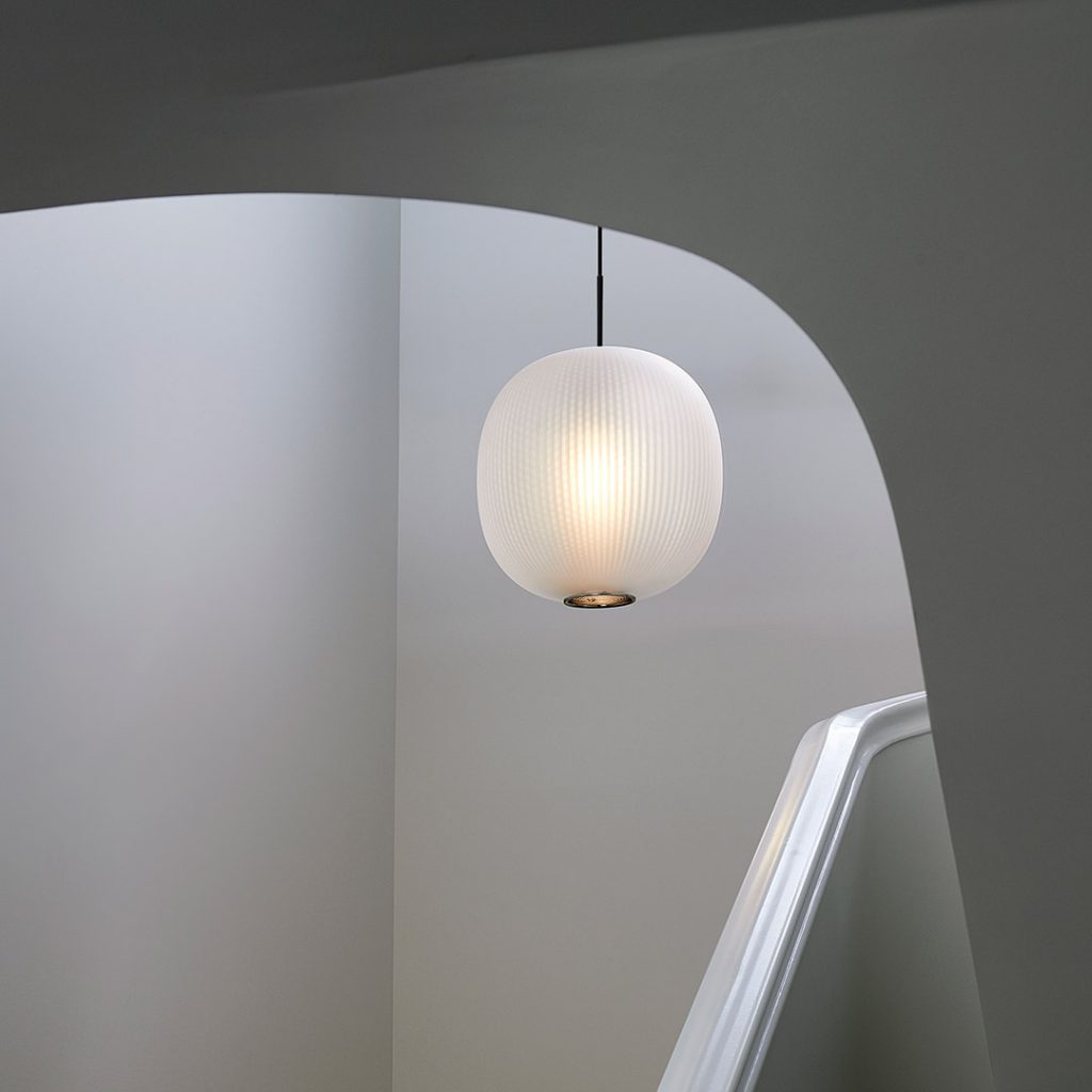 The Bloom Pendants’ super-elliptical form is inspired by the gentle dynamic flow of paper lanterns. Its glorious lit effect is the result of transparency and light. Two contrasting materials – a finely perforated mesh core and frosted blown glass, combine to project a soft focus texture onto the inside of the shade.