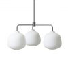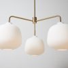 Globes of blown opal glass. The metal parts are made of steel or brass and are all lacquered. Bulbs included.