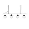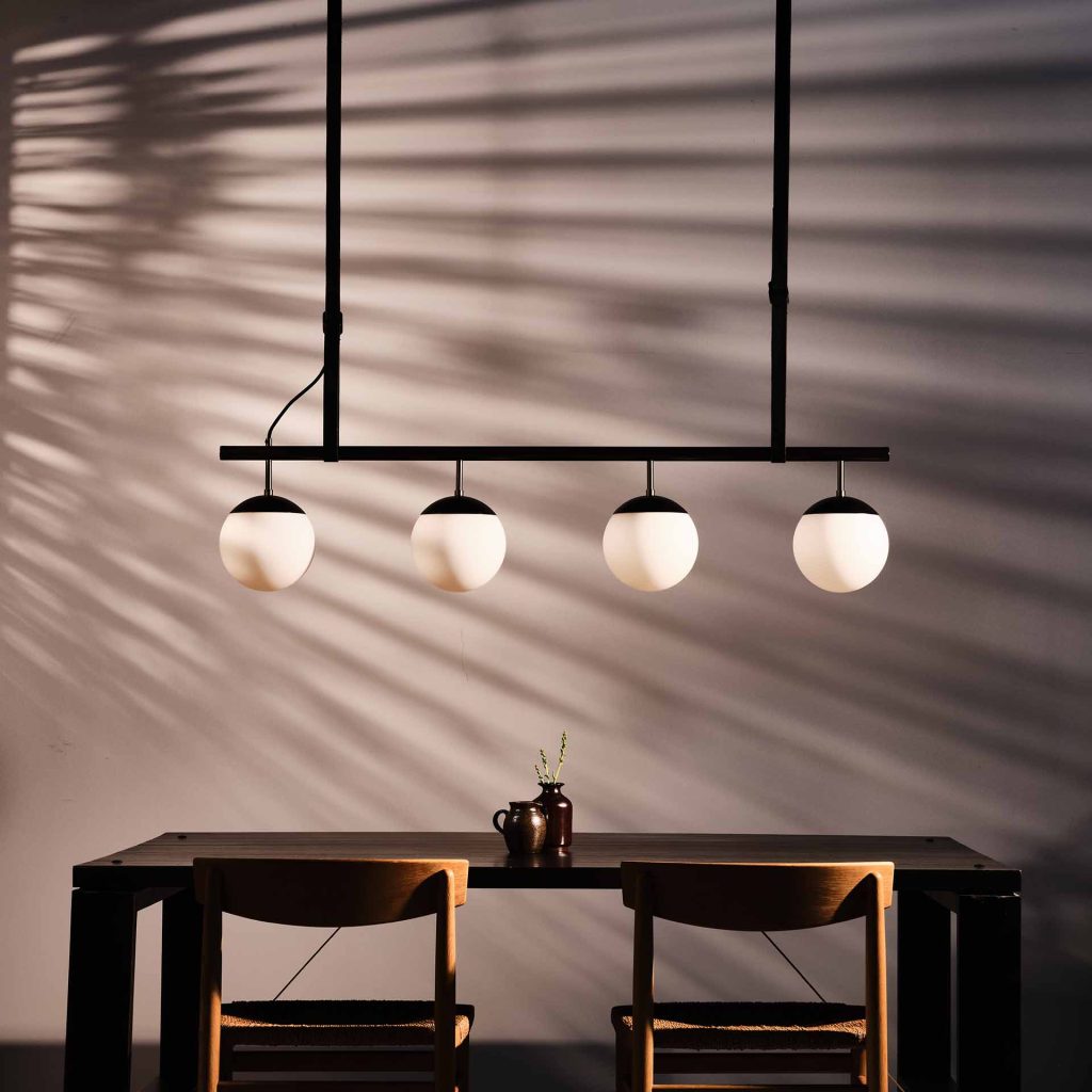 The Long Lord 4 Pendant lamp is made from a 1400mm rod of iron or brass. The glass globes have a diameter of 200mm and are either opal, smoked or brown, depending on which version you choose. All brass parts are brushed and the black lacquered version is made of iron. Black textile cord. Bulbs included.