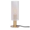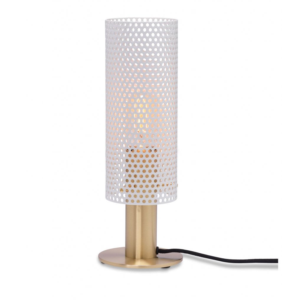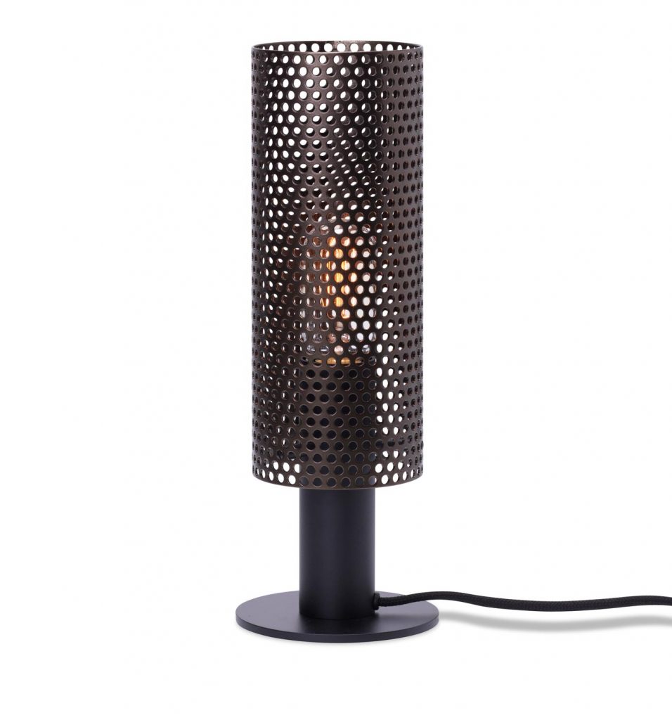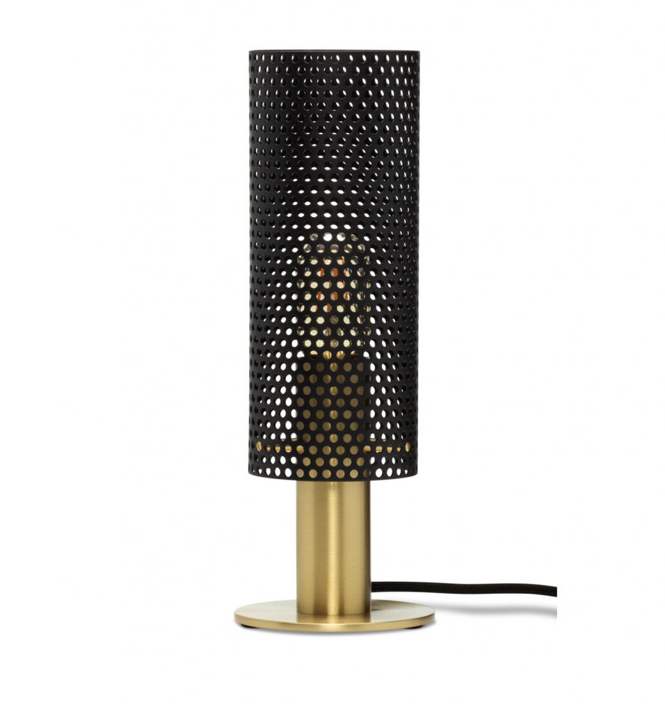 The shade is fashioned from perforated steel. The brass parts are solid and brushed. All metal parts are lacquered. Black textile cord. Bulb included.