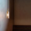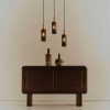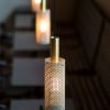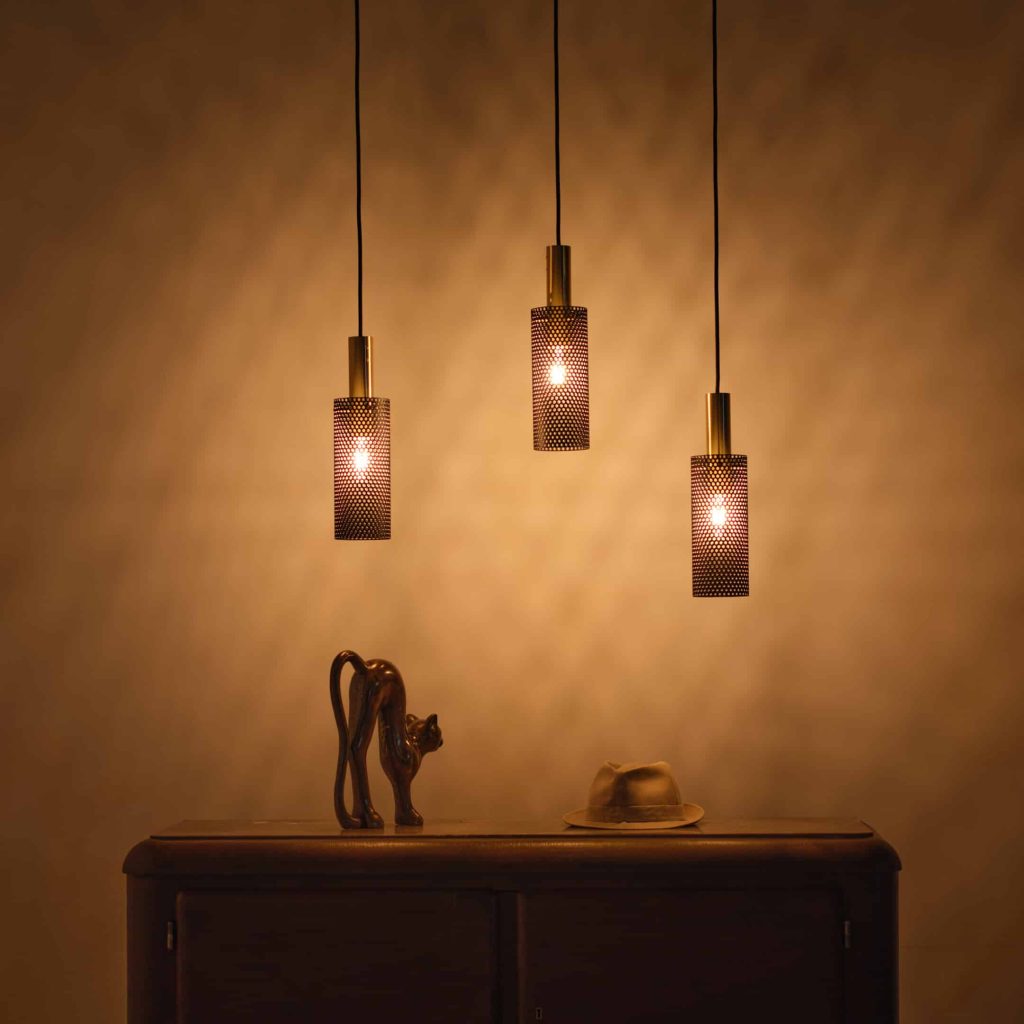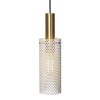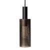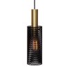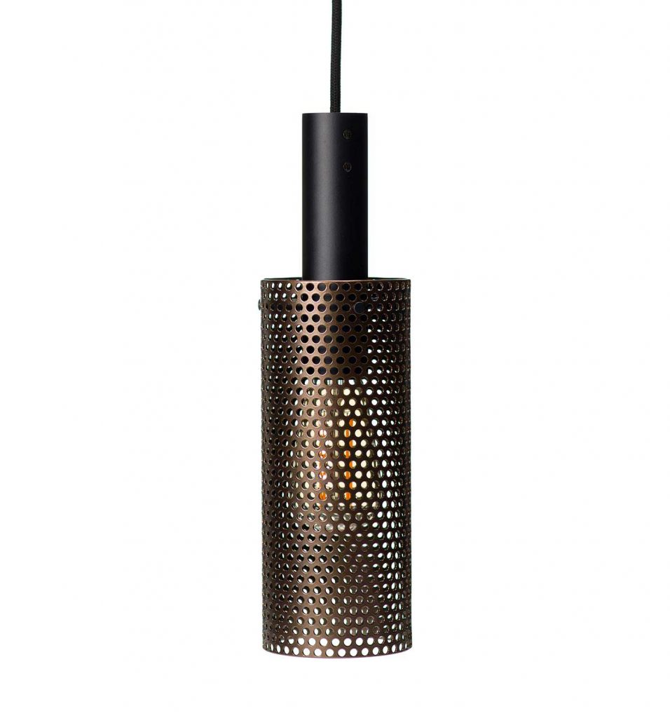 The shade is fashioned from perforated steel. The brass parts are solid and brushed. All metal parts are lacquered. Black textile cord. Bulb included.