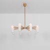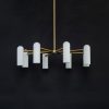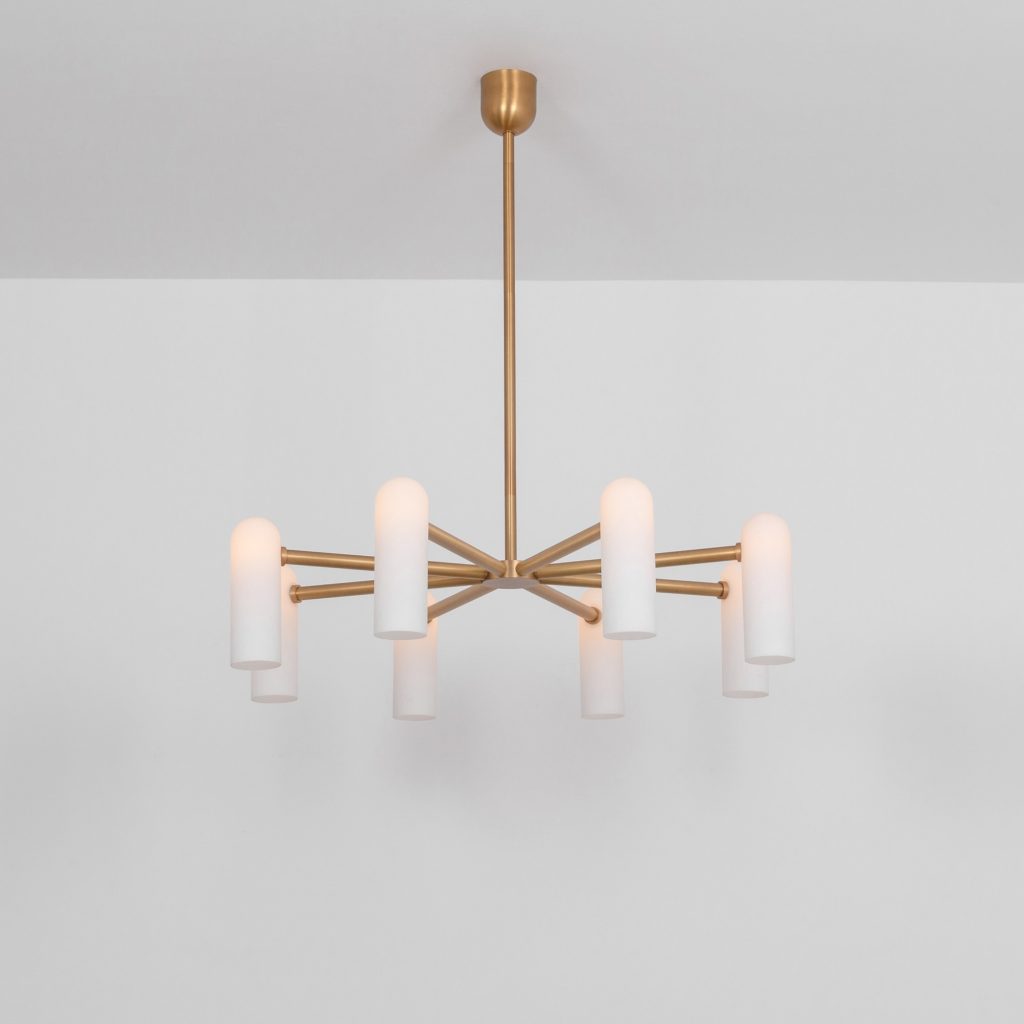 A colonnade of light sources. This delicate engine of frosted glass generates a luminous environment. Contrasting elements of solid brass create a sense of stability.