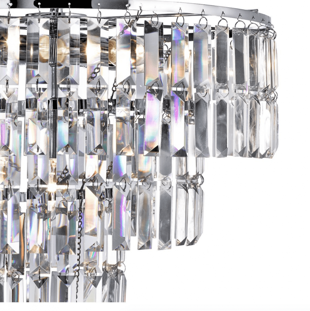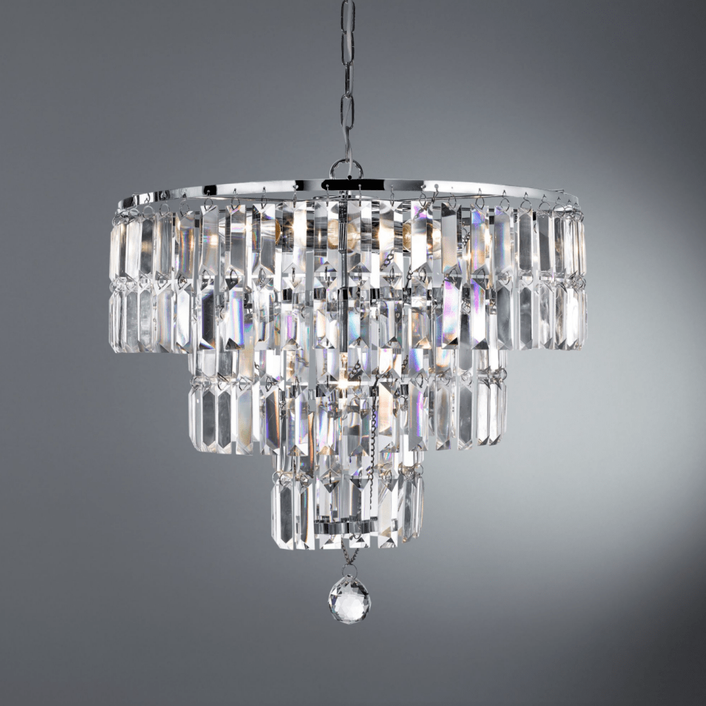 Empire is a spectacular, glittering 5 light chandelier with stunning rectangular crystal prisms hanging from a modern, chrome finish frame. Create a scintillating, jewellery-like effect with this impactful piece as the main feature in your living area or dining room.