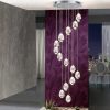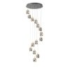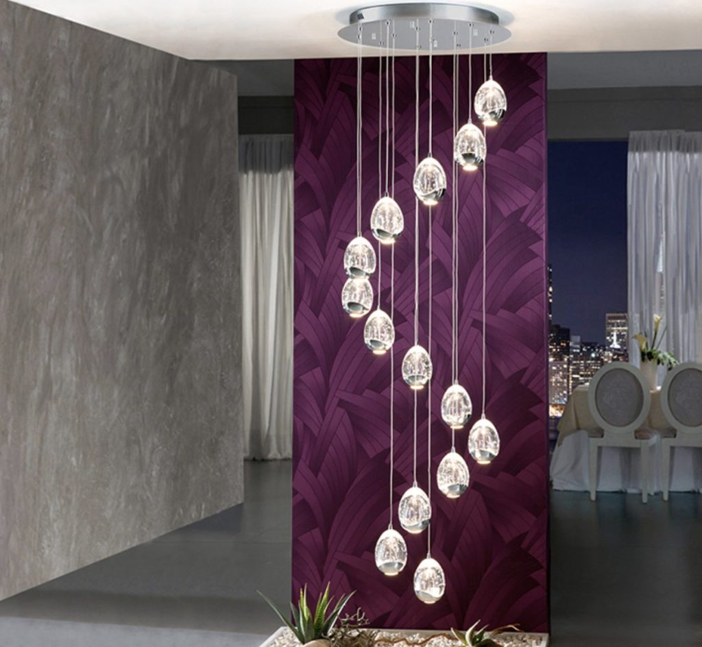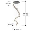Lamp of 14 LED lights. Made of metal, chrome finish. Shades with drop shape made of solid glass with decorative bubbles inside. Adjustables in length. DIMMABLE by BLUETOOTH with APP for smartphone. 70W LED, 6720 lm, 3000K.