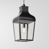 Pendant light with pagoda structure in dark bronze with outside fitted clear glass.
