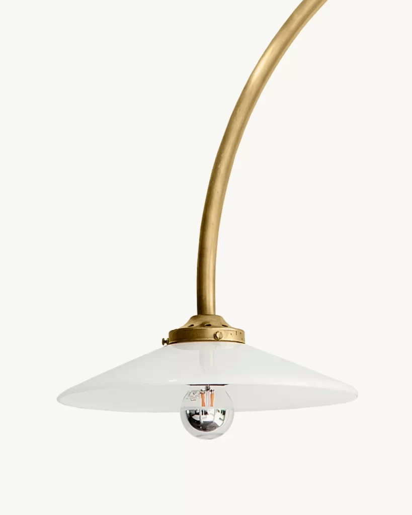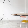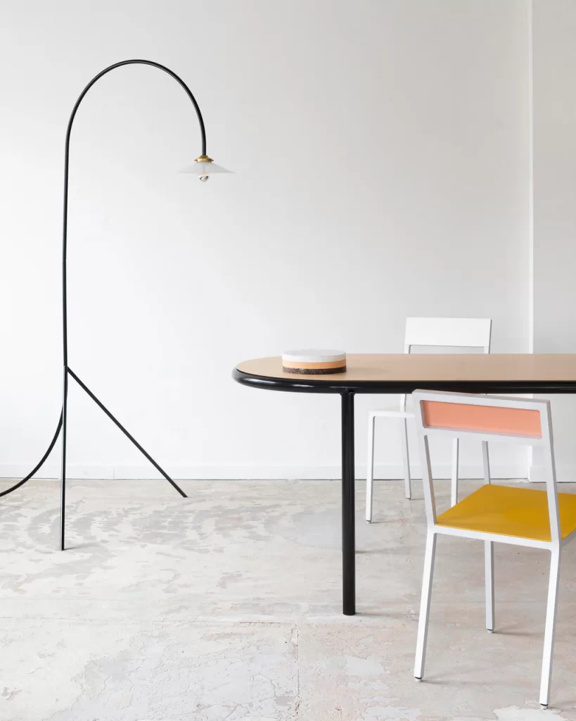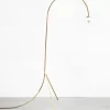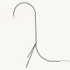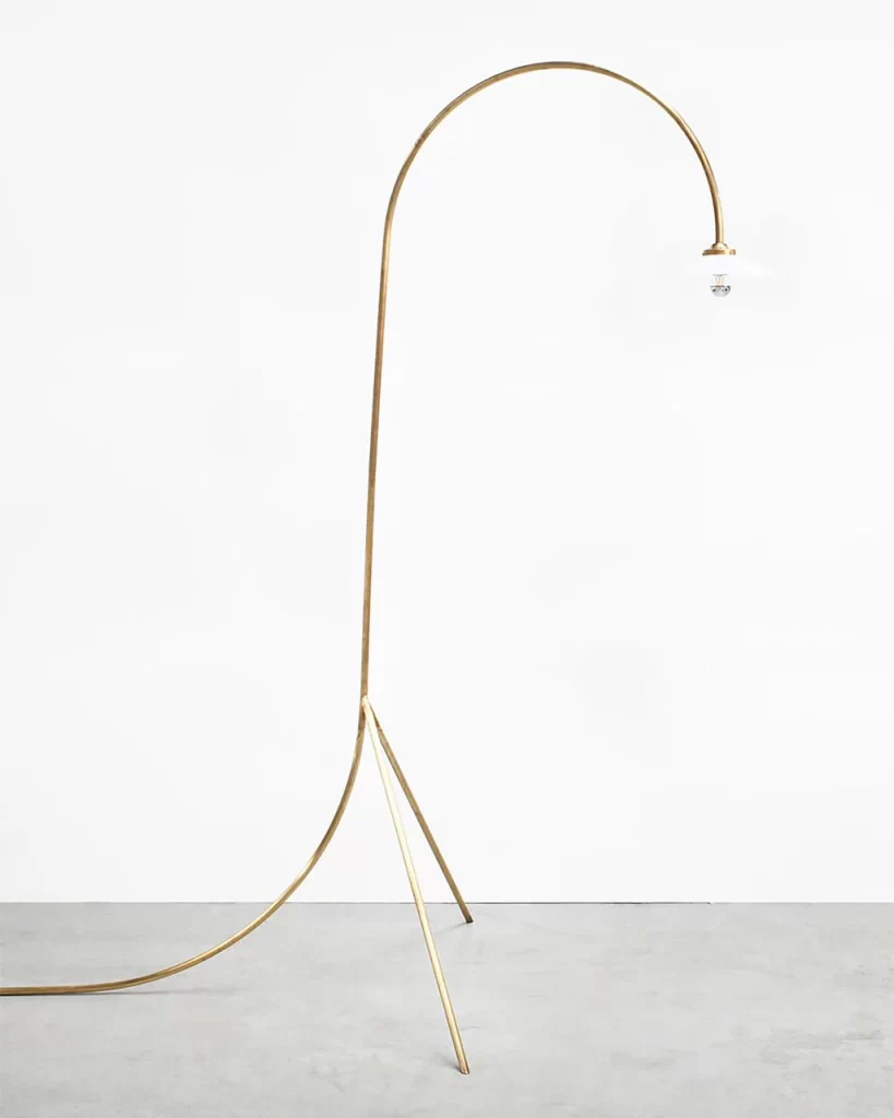 This standing lamp consists of practically nothing more than one fluent, curved line with a bulb attached to the end of it. Since this object needs to stand on the ground, two small lines were added, becoming the legs of the lamp. On one hand the basic design doesn’t draw too much attention, on the other hand its playful character does tingle the eye.